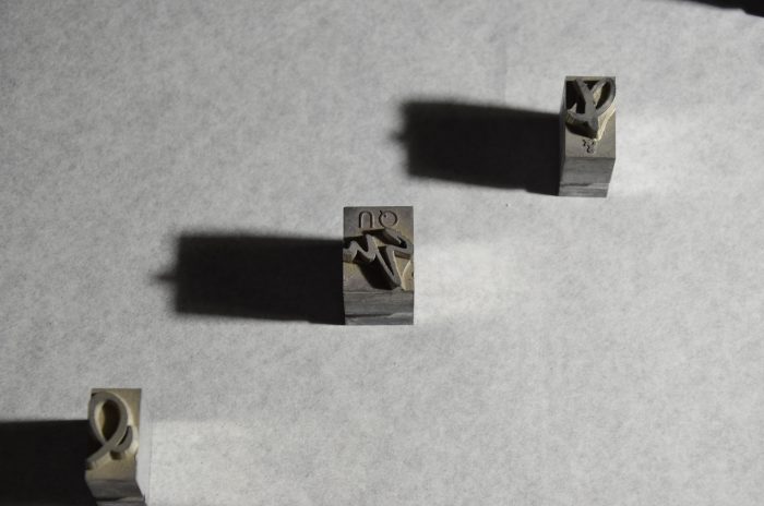 My husband and I continue to travel to Heiner Buser for casting our own type on his Monotype machines. Additionally there is more used metal type coming in, amongst it Reporter, a brush stroke style, Amati and more of Mistral. The latter counts as a script-and-brush style and is rather special. The lower case specimens are tricky to identify. The compositor has to work with the type upside down and it is always in mirror image. Composing is done on a composing stick which is adjusted to the chosen line length. To make working easier for the compositor in Mistral all lower case specimens come with a crib on the shoulder, telling which letter it is in a capital sans serif.
