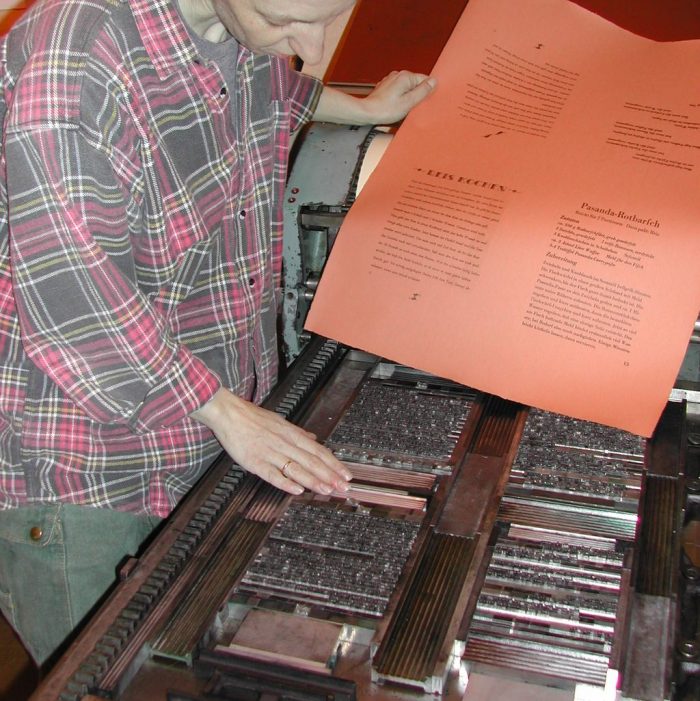 By now a reasonable number of typefaces have made themselves at home in the studio. Some older colleagues nudge me into printing a specimen book. In the olden days every printing office needed one, so clients could choose from the variety of typefaces on stock for whatever they wanted printed. This is how the second artist‘s book comes into being. The „Fernöstliche Schmausbuch“ is a typographic-philosophical collection of recipes. The maximum of typefaces from the studio‘s stock is used for the texts. A classical specimen book would show each typeface with all specimens plus a short text. The recipe book presents all typefaces in the form of either recipes or aphorisms. The majority of the recipes and wise sayings is East Asian, like a mix of curry and Confucius. They are printed on Zerkall deckled-edge paper in colours resembling ginger and cinnamon, it is a watermarked 90 gsm Ingres paper. Some 20 years later this particular papermill will be hit by the catastrophic flood in Ahrtal (Northrhine-Wetsphalia), as a result the production of deckled-edge paper is discontinued.